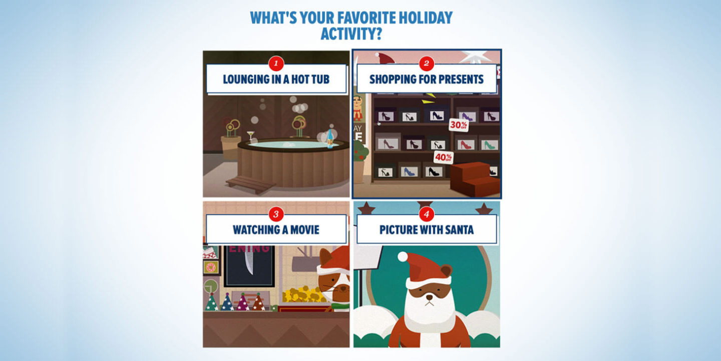 The interactive team, ClickFire Media designed and built this choose-your-own-adventure holiday experience in HTML5 optimized for a mobile-first user experience that worked seamlessly across, desktop, tablet and mobile devices. All videos are instantly shareable across Facebook and Twitter.